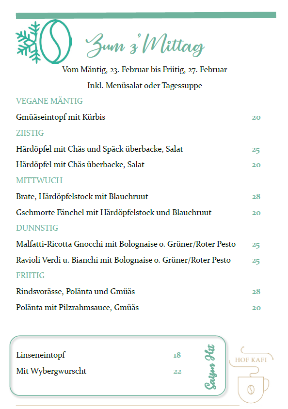 Das Kafi lädt ein zum Verweilen, Plaudern und Geniessen. Mit saisonalen und regionalen Produkten wollen wir nicht nur Gaumenfreude schenken, sondern auch ein Stück Heimatgefühl. Ein Ort, der verbindet – Generationen, Geschichten und Gesichter.