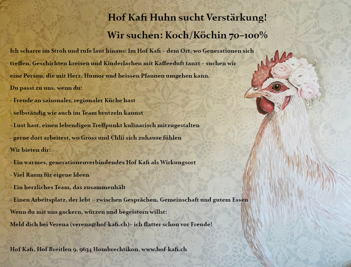 Ich, das Hof‑Kafi‑Huhn, krähe es von meinem Lieblingsbalken: Wir suchen frische Körner im Team! Also Menschen, die so herzlich kochen wie ich Eier lege – mit Hingabe, Humor und einem warmen Herz für unsere Gäste.